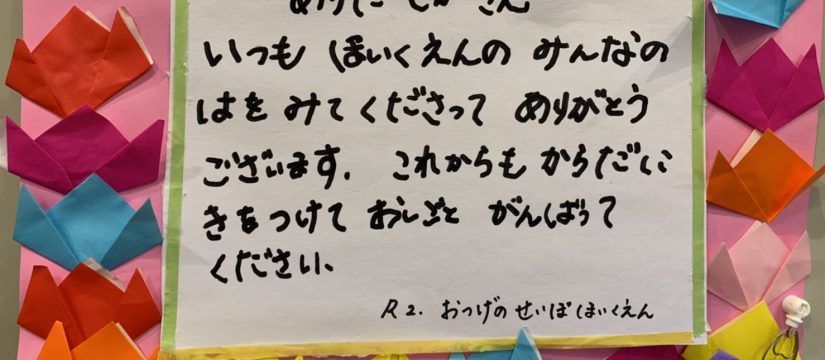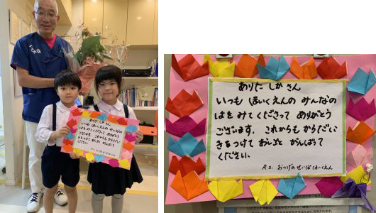 お告げの聖母保育園の園児が勤労感謝の日でプレゼントを持ってきてくれました。 2020-11-28 最終更新日時 : 2026-02-25 staff 園医をしているお告げの聖母保育園の園児が勤労感謝の日で花束と手作りカードを持ってきてくれました。