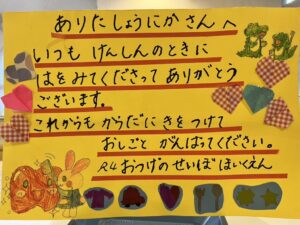 園医をしているお告げの聖母保育園の園児が勤労感謝の日で花束と手作りカードを持ってきてくれました。かわいい声でお手紙の内容を読み上げてくれました。毎年ありがとうございます。