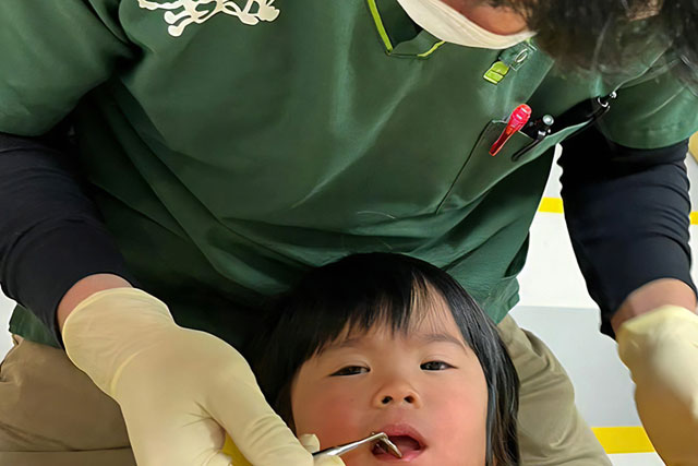 フッ化物歯面塗布との複合応用によって、歯面塗布のみの群に比べ乳歯むし歯の減少率65%が認められています。