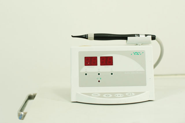 下の装置は、ダイアグノデントという機器で、レーザー光を利用して、う蝕(むし歯)の状態や進行状態を計ることができます。