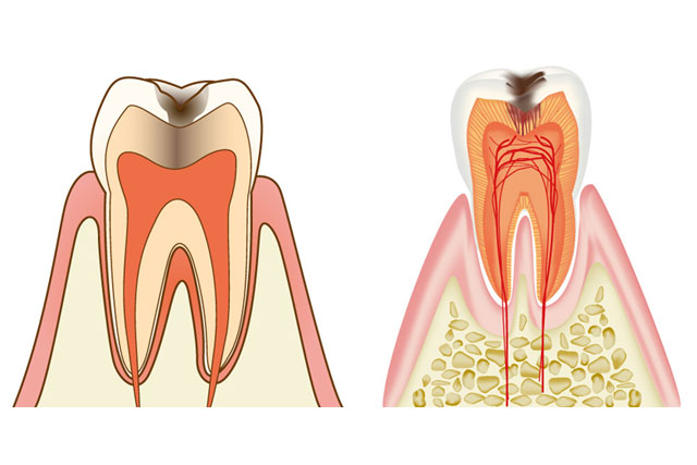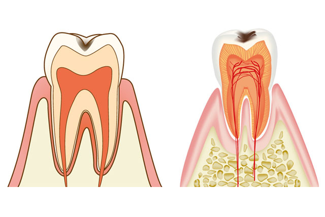 C2とは、象牙質(エナメル質の内側にあり、神経細胞が延びてきている組織)に移行した状態で、痛みを伴うようになるので、治療の対象となります。