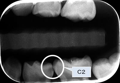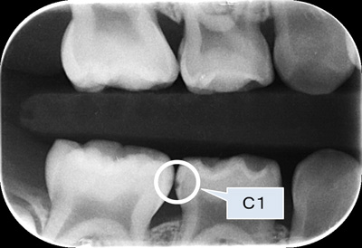 下のレントゲンはバイトウィング法(咬翼法)という撮影法で、隣接面(歯と歯の間)のう蝕(むし歯)をチェックする方法で、C1のう蝕(むし歯)を示しています。
